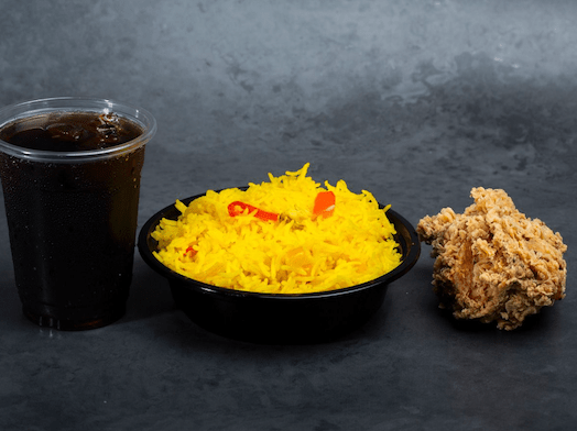 A single piece of crispy fried chicken served with your choice of rice or spaghetti and a refreshing drink.