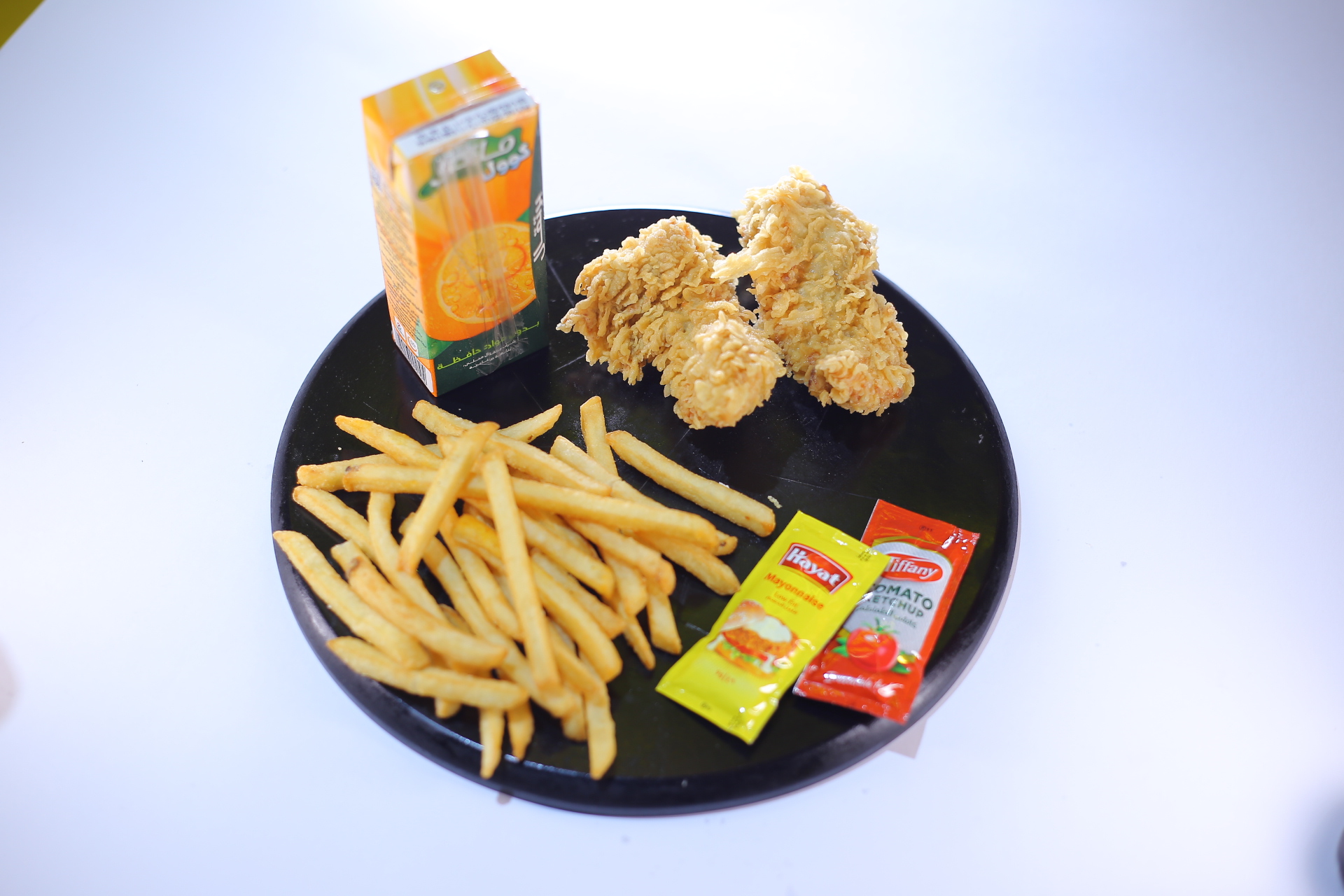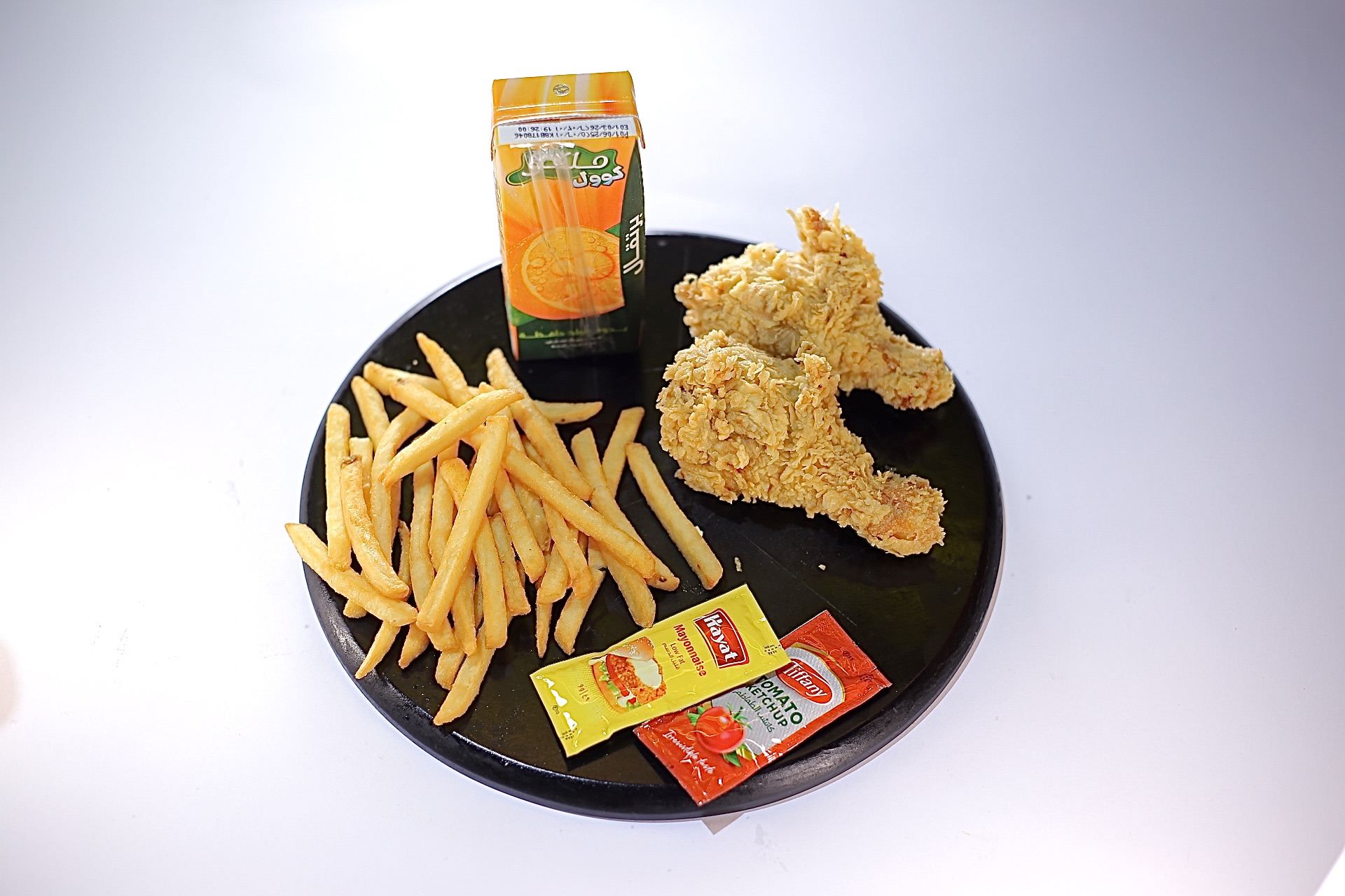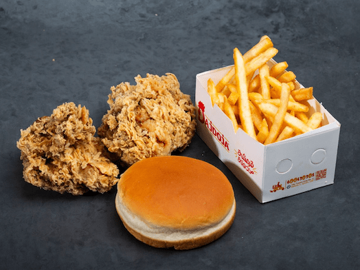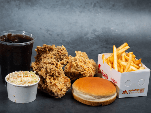 2 pieces of crispy fried chicken served with your choice of soft bun, and crunchy golden fries.