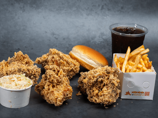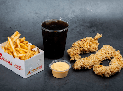 A filling meal contains 4 pieces of chicken, crunchy golden fries, a soft bun, coleslaw salad, and a refreshing drink.