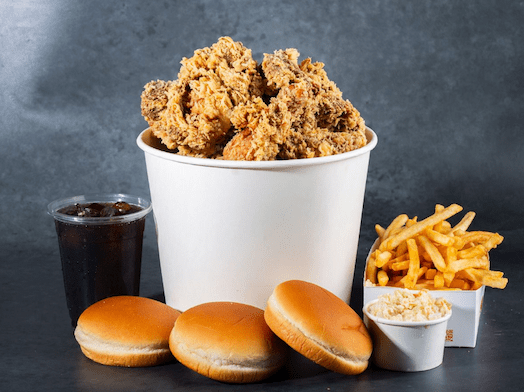 This bucket includes 8 pieces of fried chicken, 2 large crunchy golden fries, 2 pieces buns, two servings of coleslaw salad, and 2 refreshing drinks.