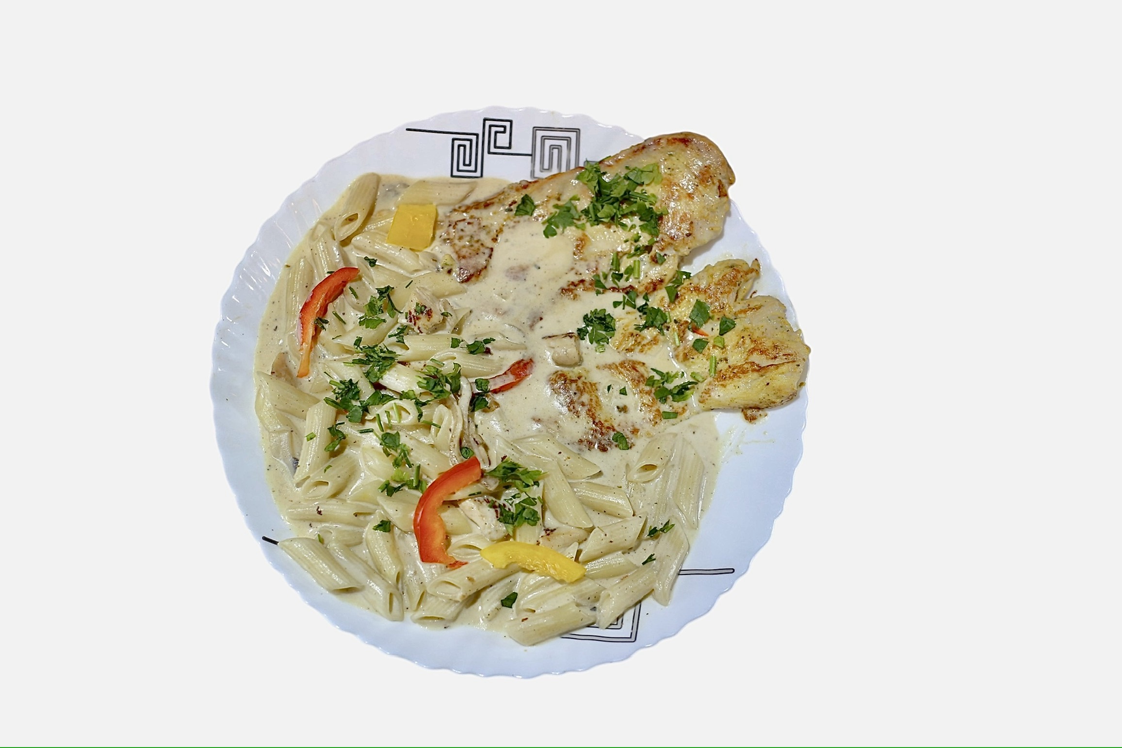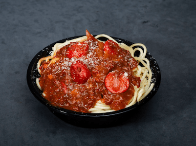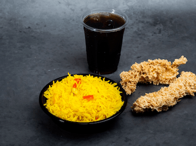 A meal featuring 2 pieces crispy chicken strips served with your choice of rice or spaghetti, cheese sauce, and a refreshing drink.