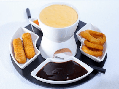 For your party featuring 15 pieces crispy chicken strips, 4 servings crunchy golden fries, 4 coleslaw servings, cheese sauce, & 4 refreshing drinks