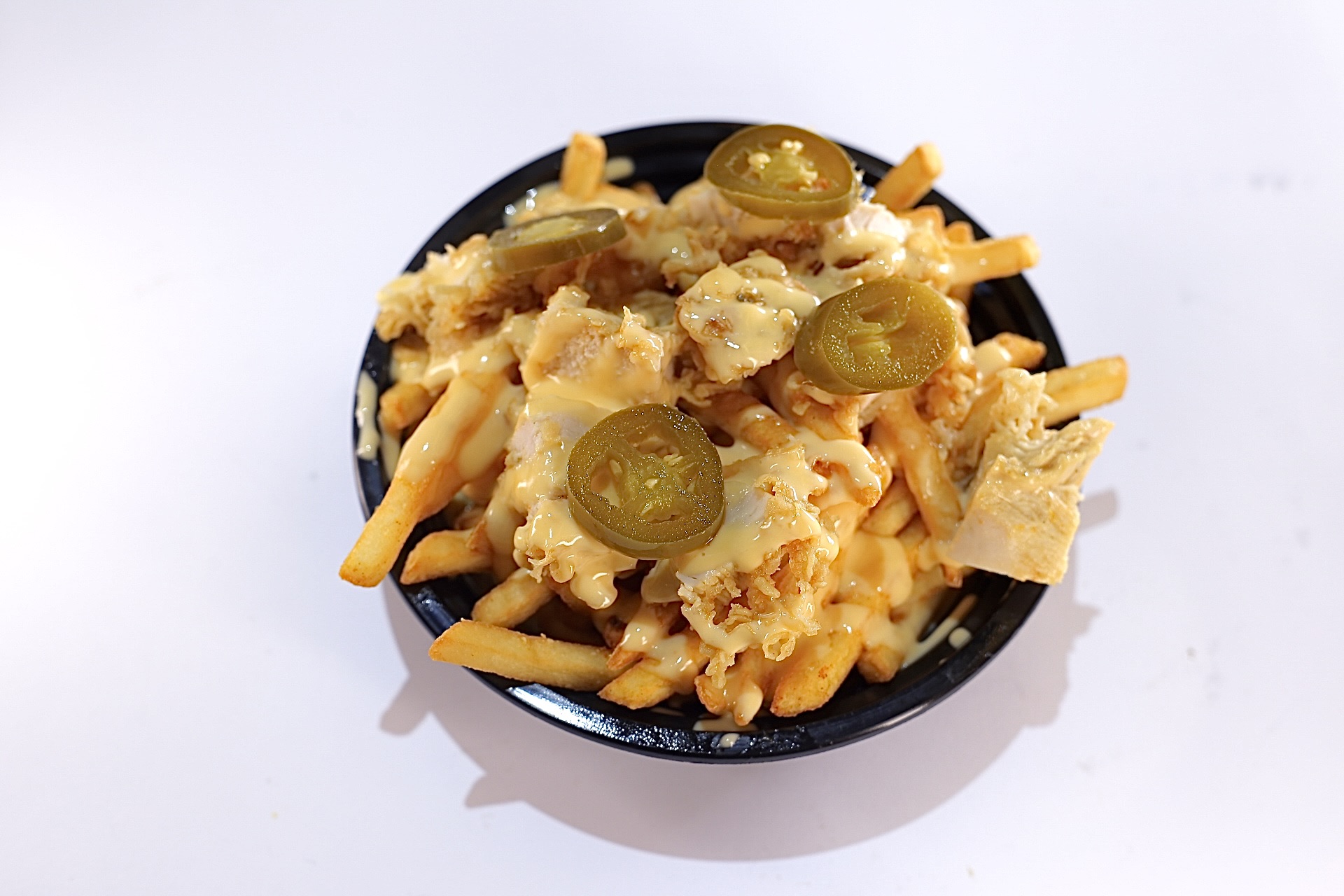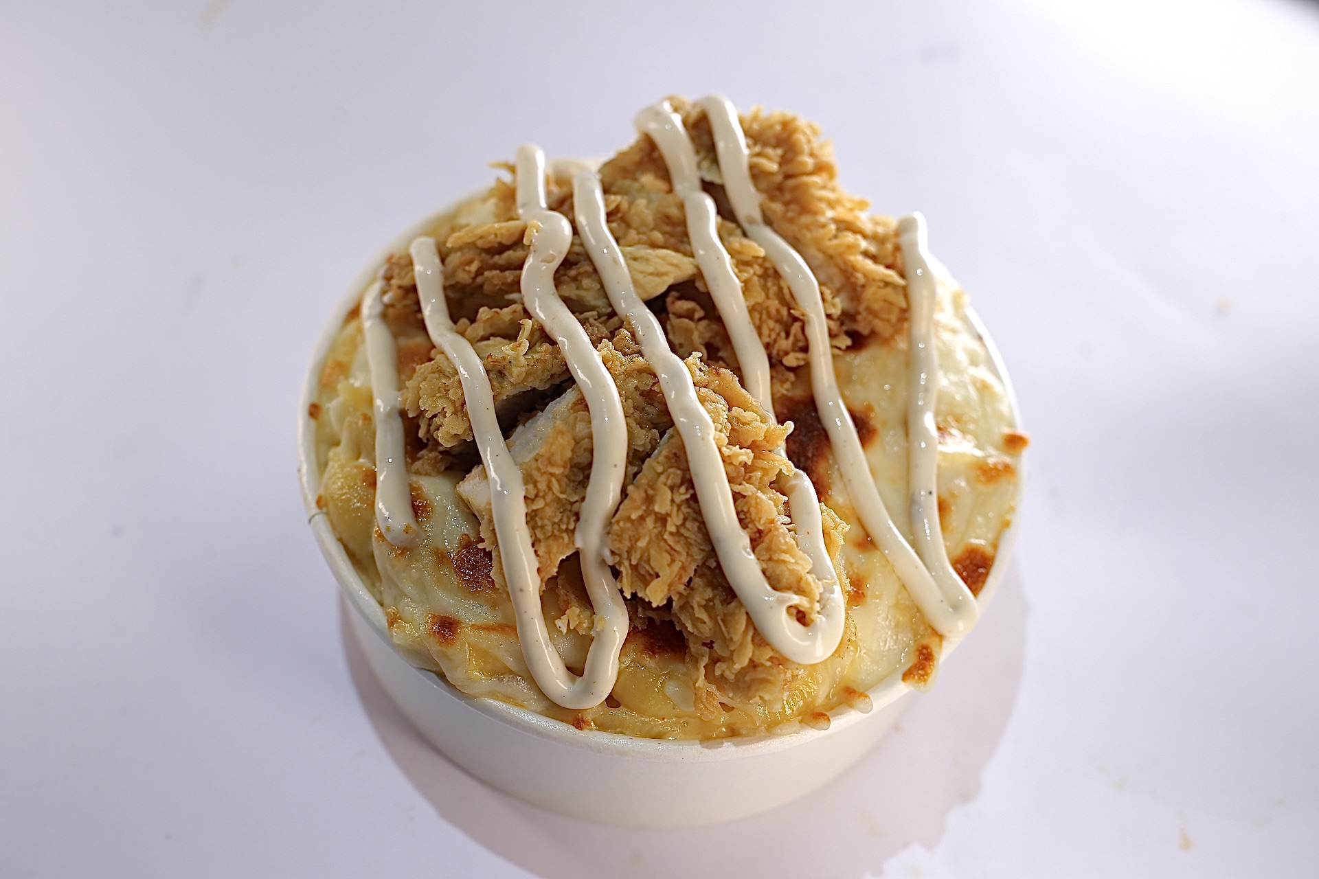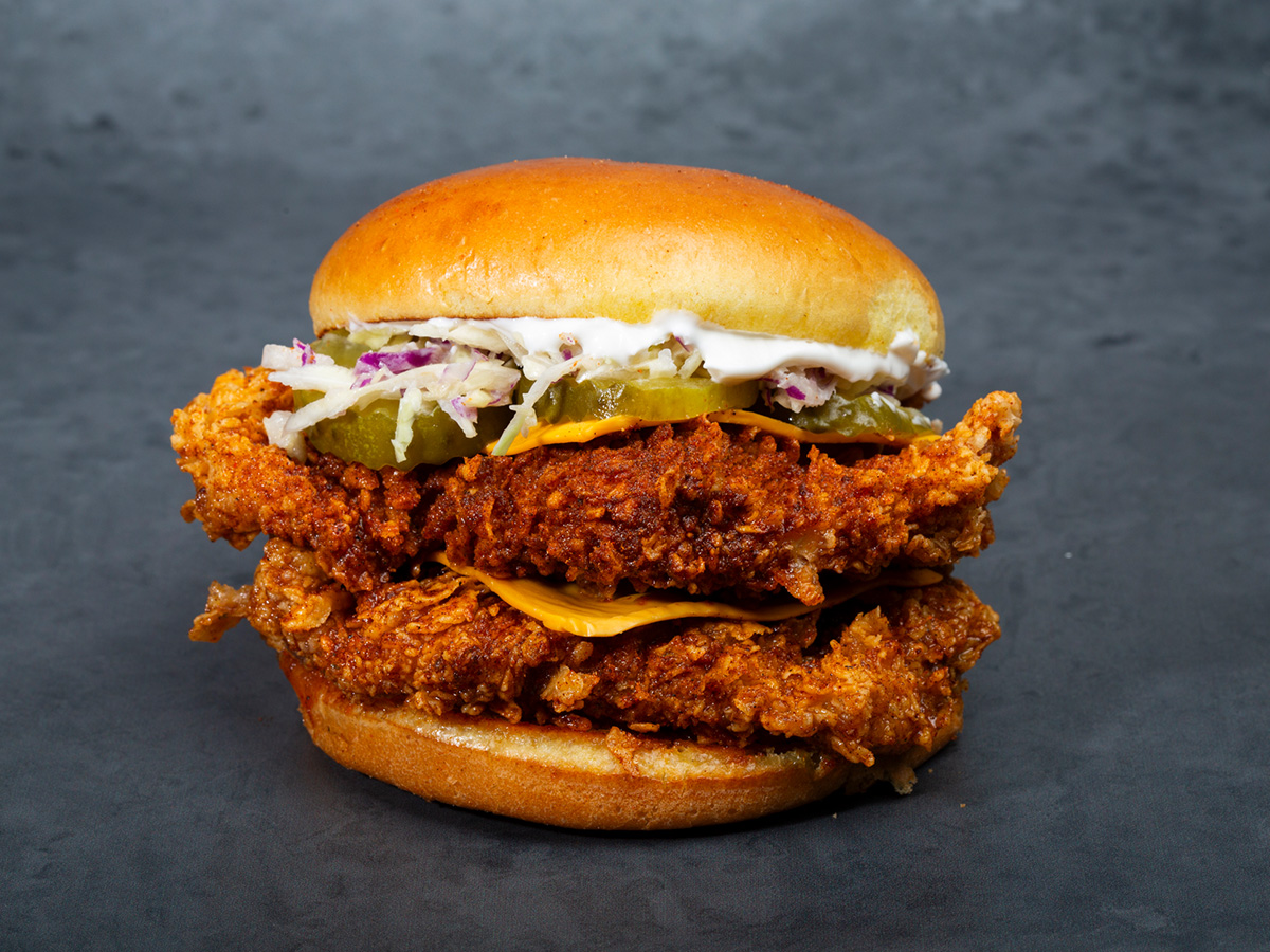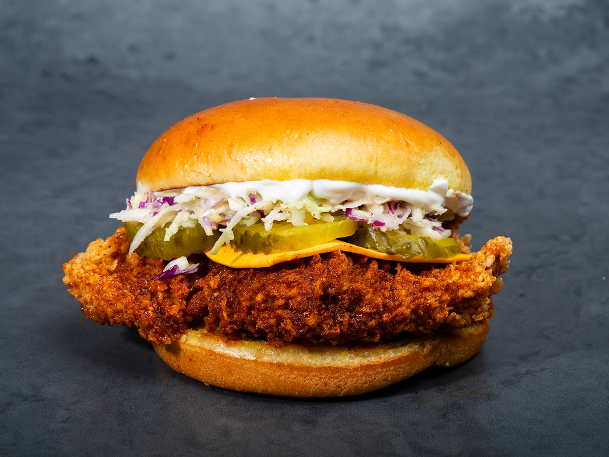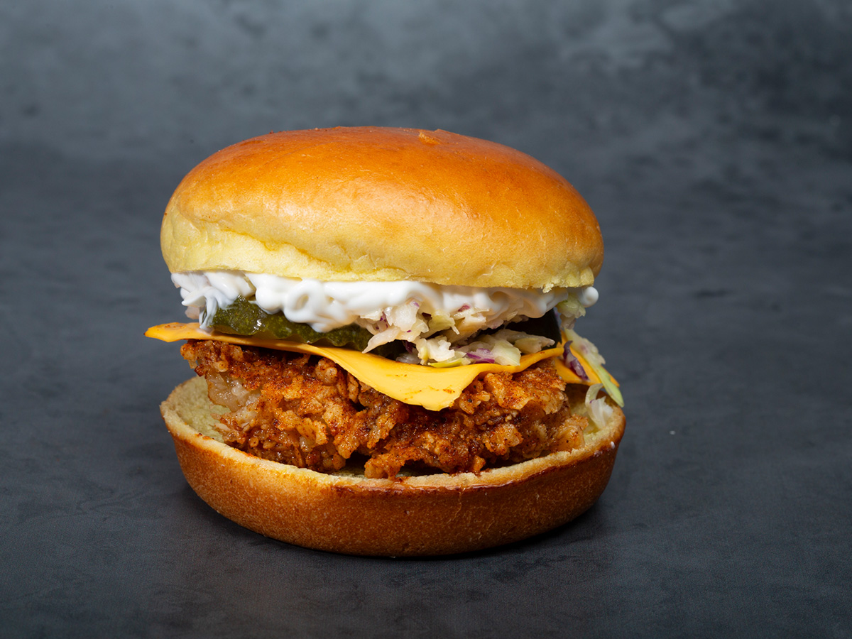 Brioche bun, mayonnaise, pickles, cheese sauce, 60g crispy chicken piece with Nashville special sauce.