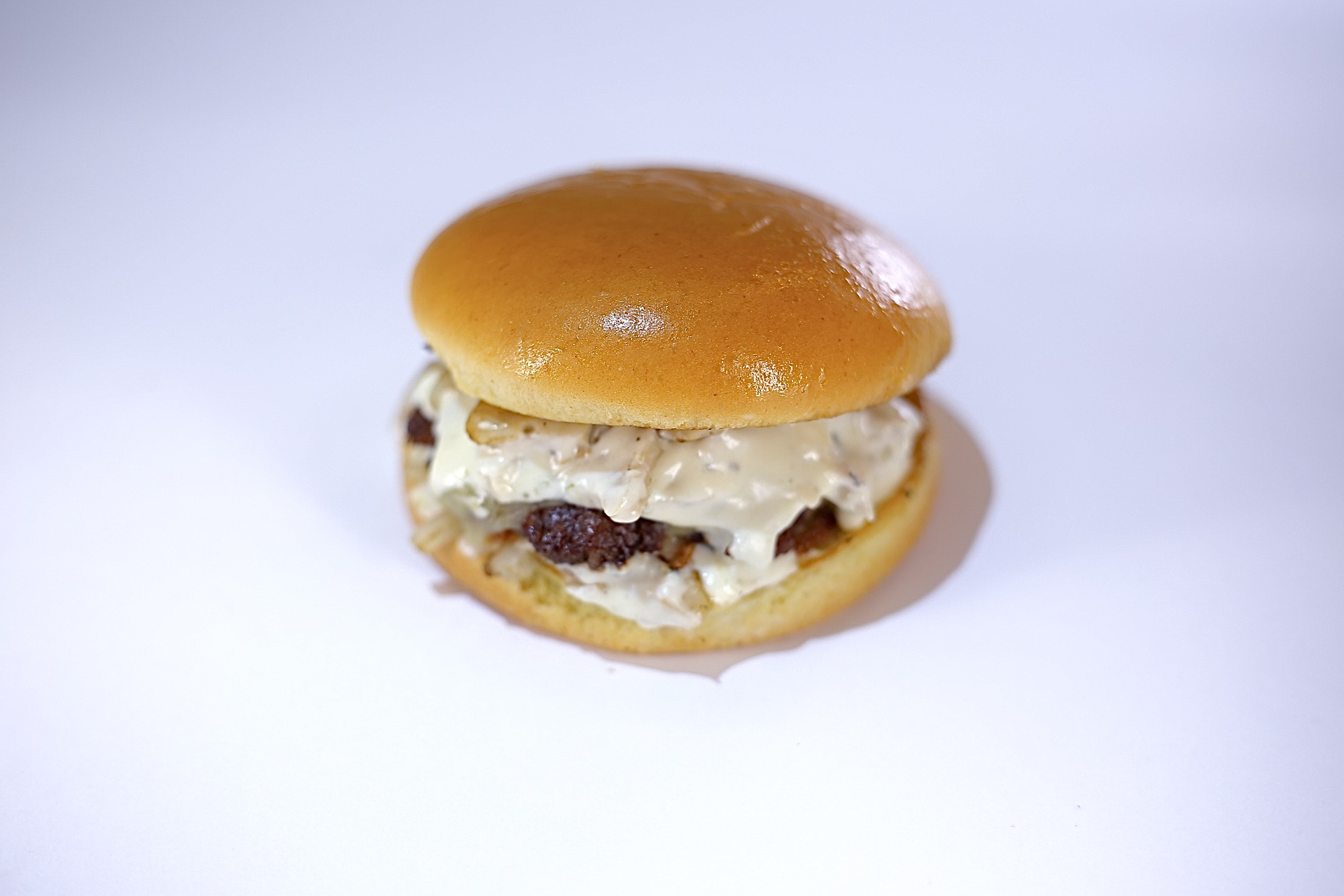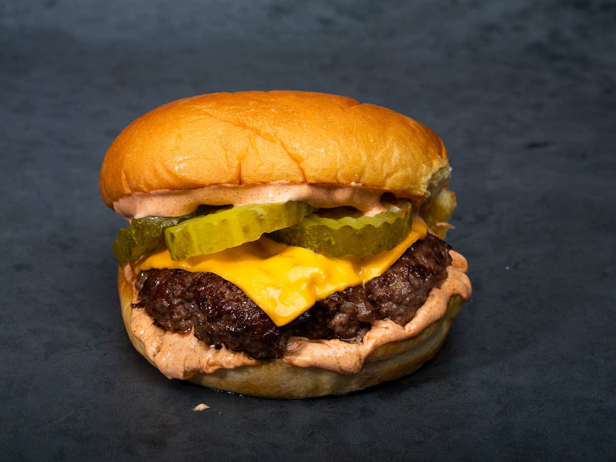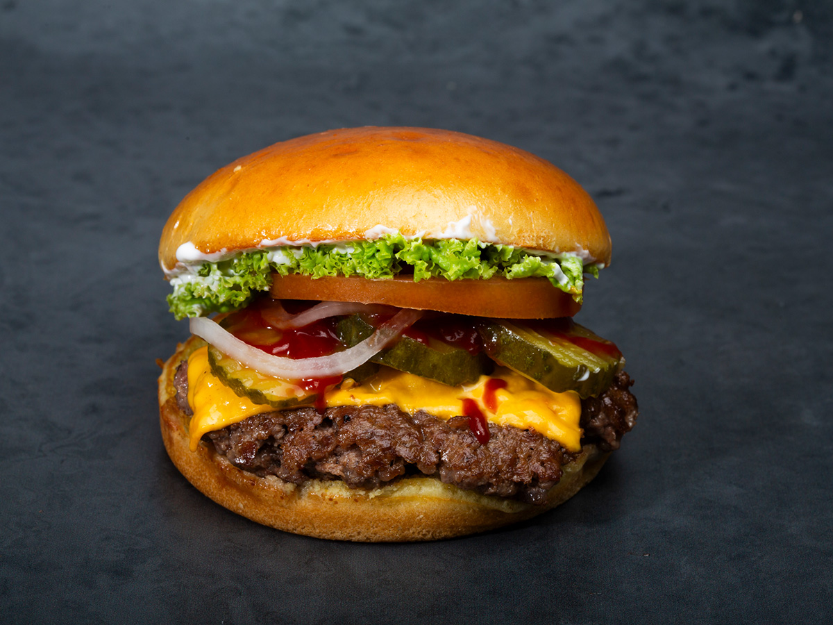 Potato bun, original suce, pickle, slice cheese, and beef patty 100 gm