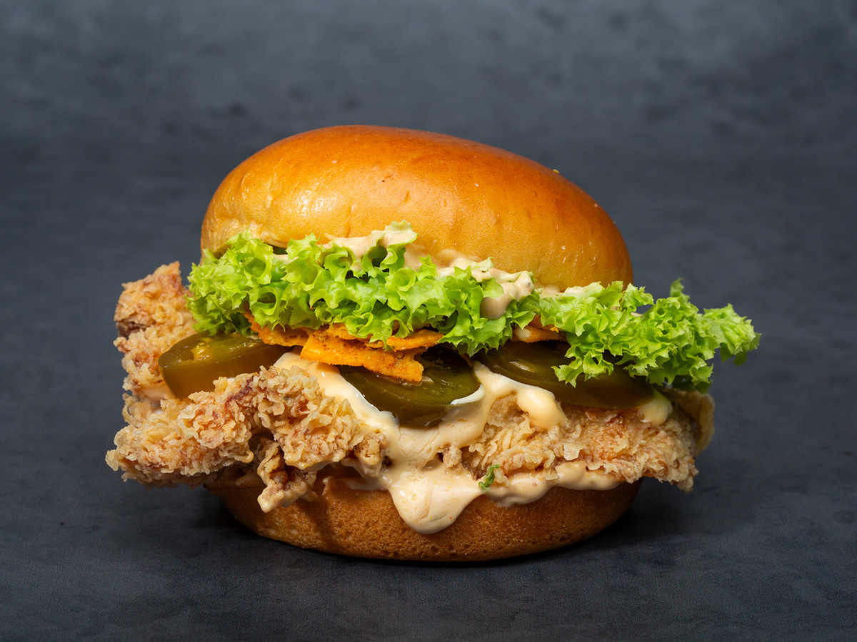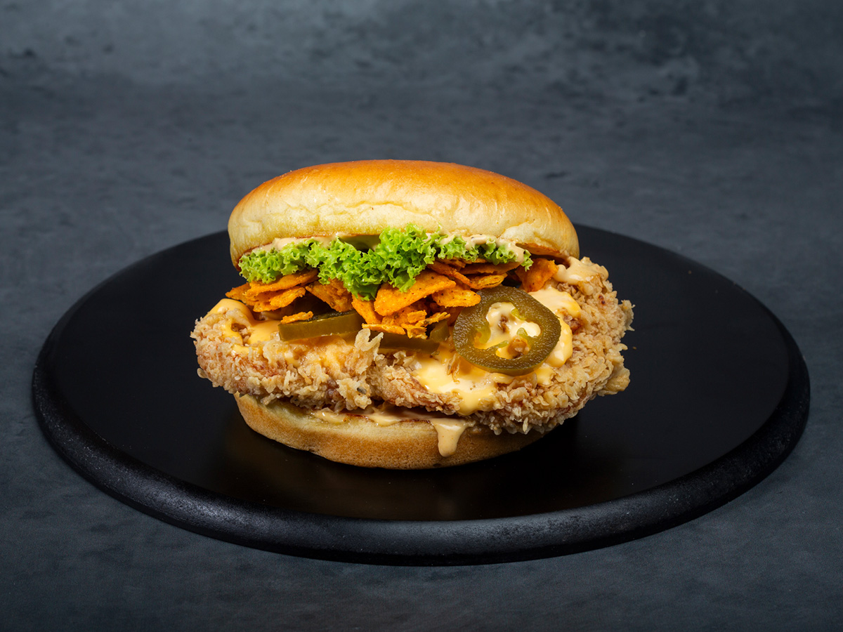 Brioche bun, Cheetos sauce, Doritos, jalapeno, cheese sauce, crispy chicken piece 100g and lettuce