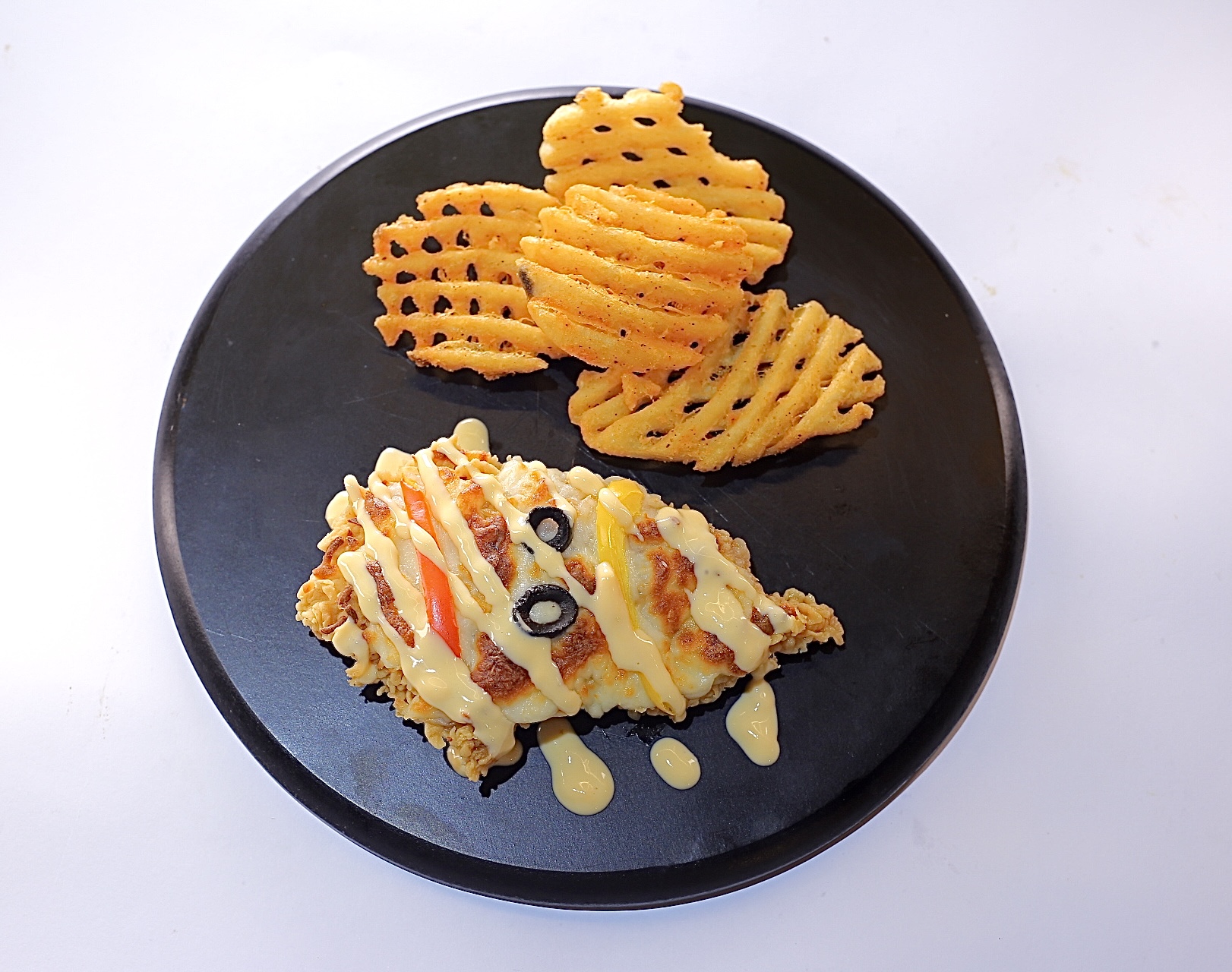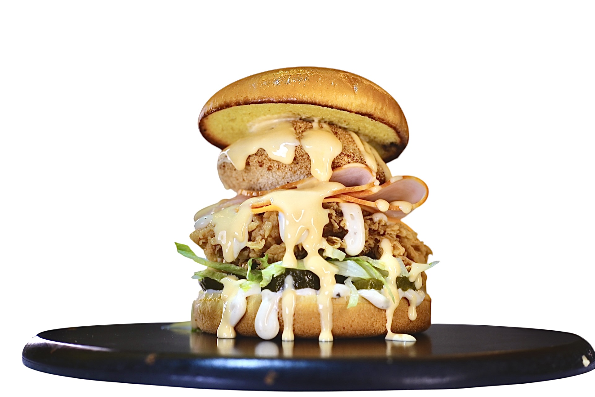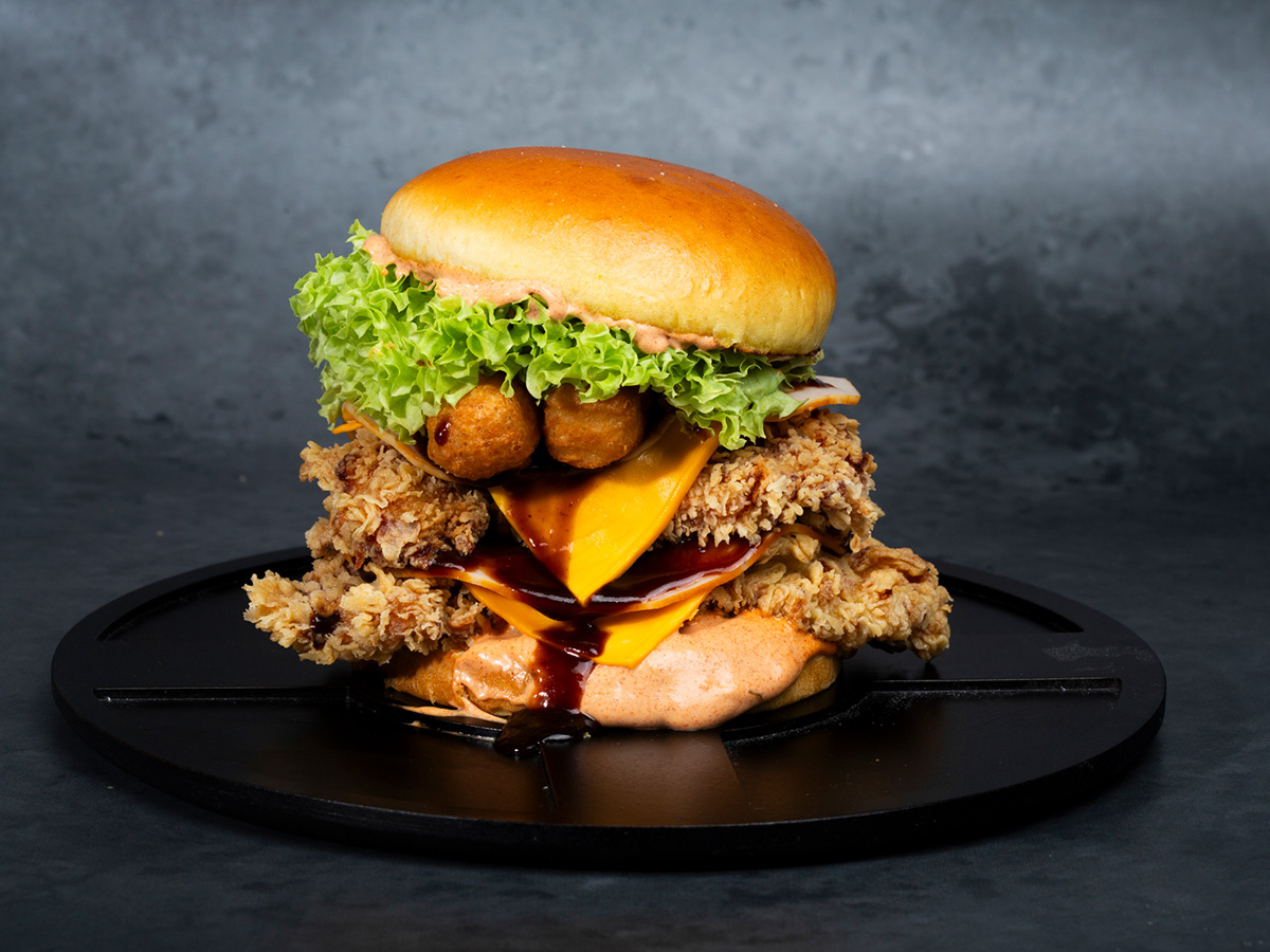Brioche bun, original sauce, Mozzarella sticks, BBQ sauce,turkey slices, cheese slices, crispy chicken piece 200gm