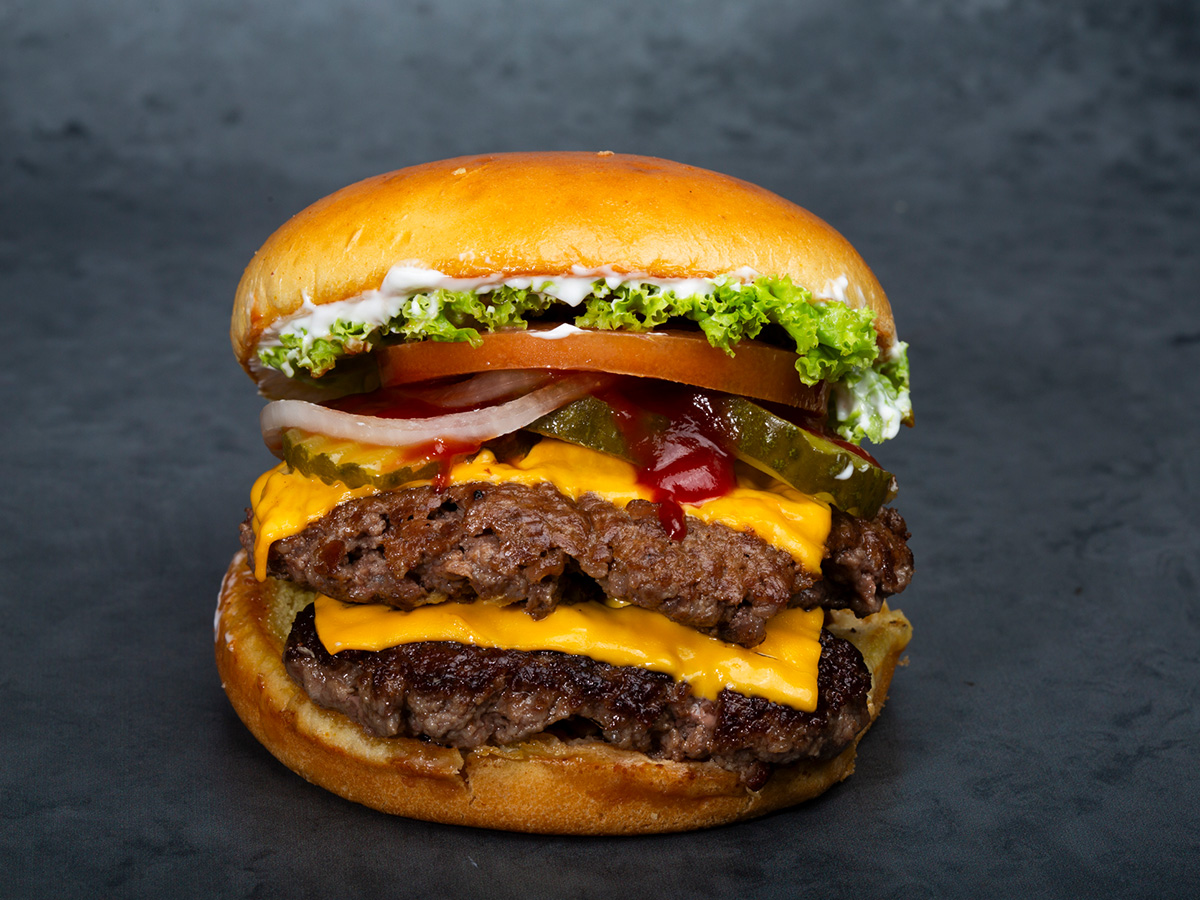 Potato bun, mayonnaise, lettuce slices, tomato slice, onion, ketchup, sauce, pickle, cheese slice and beef patty.