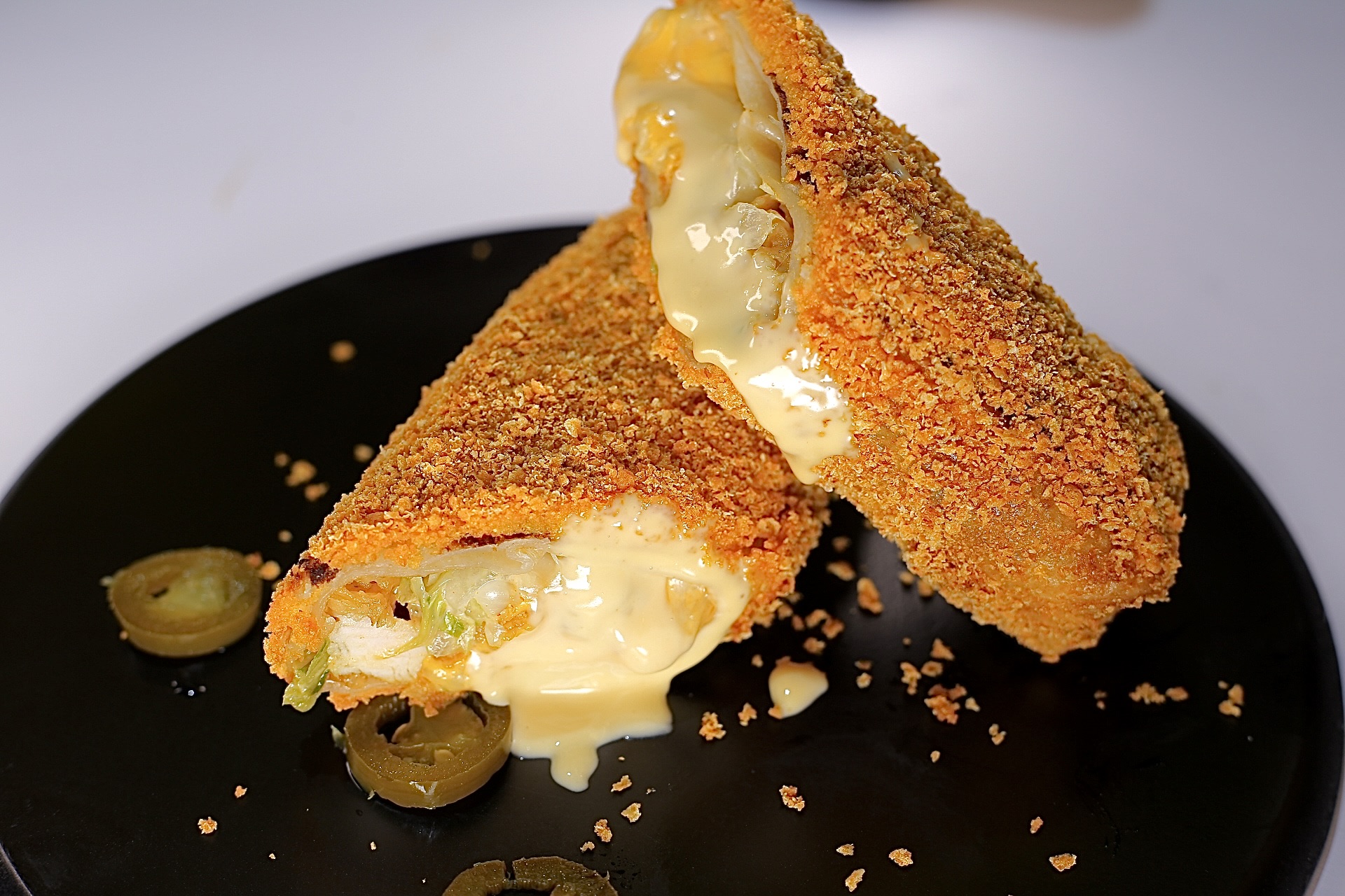 Brioche bun, Cheetos sauce, Doritos, jalapeno, cheese sauce, Crispy chicken piece 200 gm, lettuce
